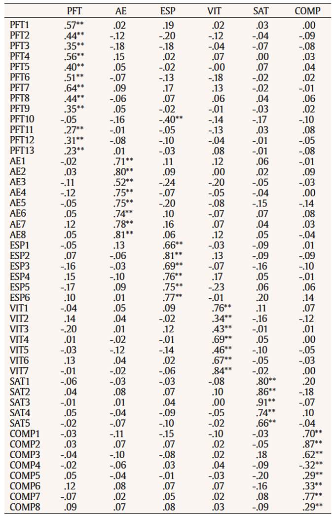Para mayor detalle sobre el resultado de la prueba de validez, en la Tabla 2 se muestran las cargas (pesos) factoriales obtenidas en el modelo de seis factores. Como se indica, con excepción de un caso en la escala de PFT (PFT10), todos los reactivos tienen cargas significativas a nivel de .01 en sus respectivos constructos. Con esta excepción, en la Tabla 2 no se presentan más cargas cruzadas [cross loadings]significativas. Esta información indica que la estructura factorial de los datos es adecuada y, además, que las escalas utilizadas en español (versión mexicana) no presentan alteraciones importantes con respecto a sus originales en inglés. Los pesos factoriales corresponden a la solución completamente estandarizada en LISREL.