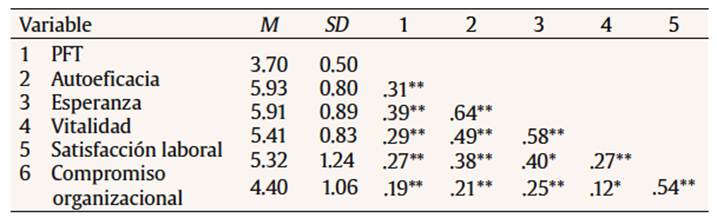 No obstante, la relación de la PFT con la satisfacción laboral y el compromiso organizacional podría no ser directa sino estar mediada por recursos psicológicos, como la autoeficacia y por fortalezas del carácter, como la esperanza y la vitalidad.