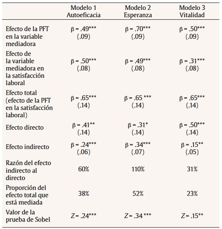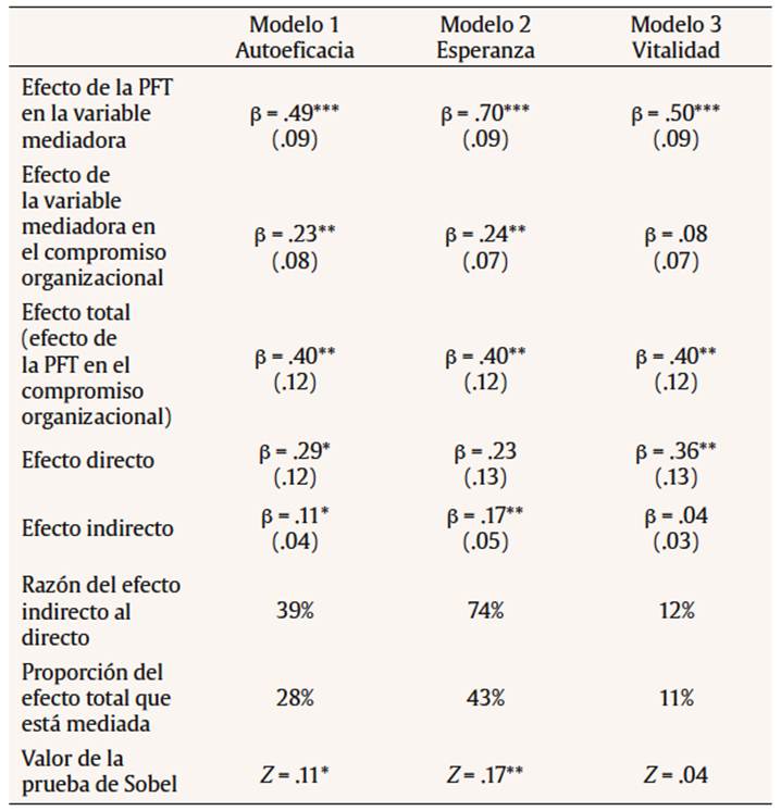 Además de lo anterior, en las Tablas 4 y 5 se puede apreciar que el efecto total de la PFT es más grande en la satisfacción laboral que en el compromiso organizacional (.65 vs. .40) y que la proporción mediada por la autoeficacia es más intensa en el primer caso que en el segundo (38% vs. 28%).