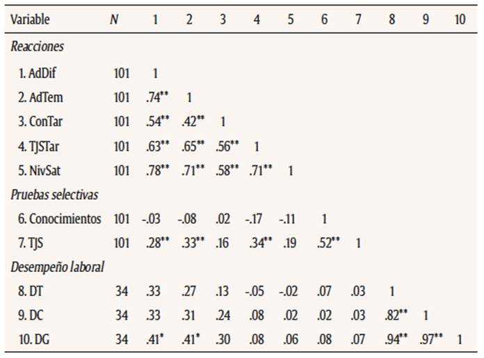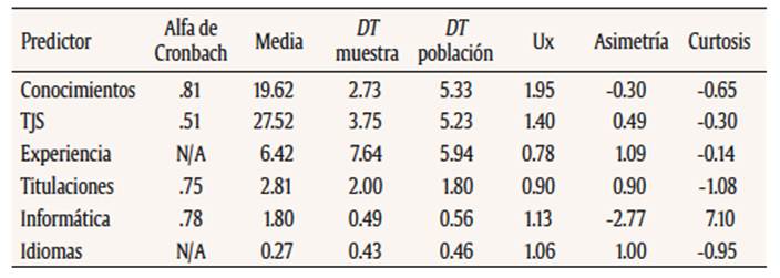 En las Tablas 1 y 2 se observan las medias y desviaciones típicas de los predictores y criterios empleados. En el caso de los procedimientos selectivos la media de la experiencia es de 6.42 (equivalente a 4.37 años de servicios en puestos similares). Por lo que se refiere a las medidas de desempeño, las medias son muy elevadas, estando cerca de la puntuación máxima de la escala, y las desviaciones típicas de DG, DT y DT han oscilado entre .54 y .70. La fiabilidad de estas medidas de desempeño fue adecuada (Nunnally, 1978), presentando valores superiores a .70 en todos los casos, con la excepción de persistencia/tenacidad.