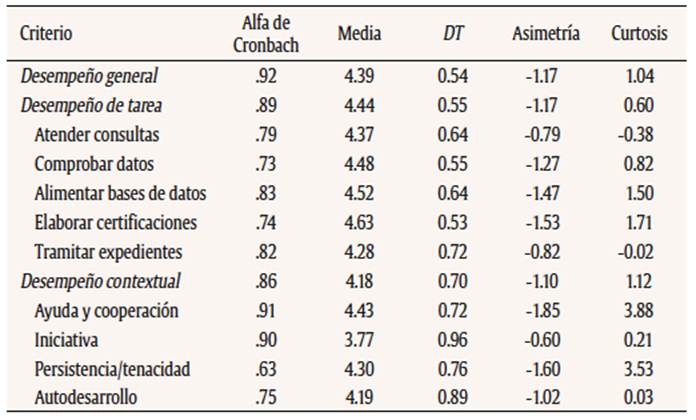 La escala de evaluación de cada ítem contó con cinco niveles (de 1, el nivel de desempeño más negativo o inadecuado, a 5, el nivel de desempeño más positivo o adecuado). La media de las puntuaciones en desempeño de tarea (DT) y desempeño contextual (DC) permitió obtener un valor de desempeño general (DG). El coeficiente alfa de Cronbach de DG, DT y DC fue, respectivamente, de .92, .89 y .86. Los coeficientes alfa de las subdimensiones oscilaron entre .63 y .91.