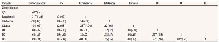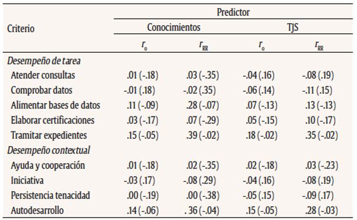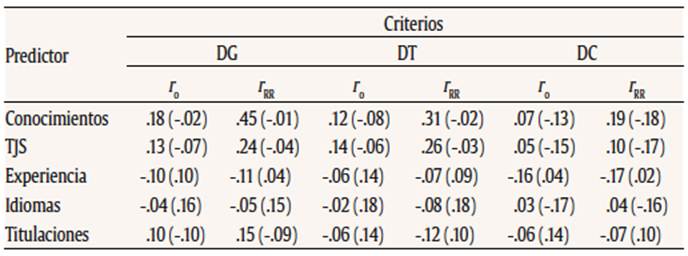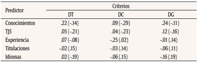 En cuanto a la magnitud de las correlaciones corregidas encontradas, la prueba de conocimientos presentó un valor de .24 con DG como criterio y de .22 con DT a partir de los valores de las correlaciones observadas (correlaciones entre .08 y .09). EL TJS presentó correlaciones corregidas muy bajas (entre .05 y .12), la experiencia osciló entre -.25 y .07, las titulaciones académicas presentaron valores entre -.06 y -.02 y el conocimiento de idiomas osciló entre -.16 y .02.