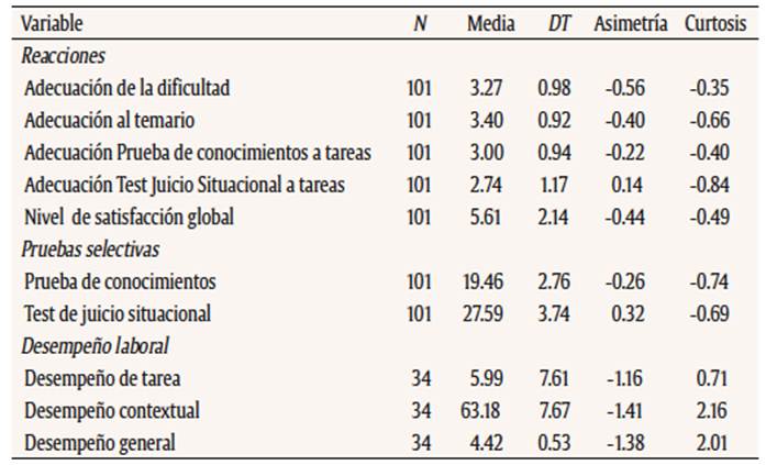 Reacciones de los candidatos. Las reacciones de los candidatos se midieron mediante un cuestionario de 5 ítems que evaluaron respectivamente la adecuación de la dificultad de las pruebas eliminatorias (conocimientos y TJS), el grado de adecuación al temario de las pruebas eliminatorias, el grado de adecuación a las tareas del puesto de la prueba de conocimientos, el grado de adecuación a las tareas del puesto del TJS y el nivel de satisfacción global con respecto a la justicia procedimental del proceso selectivo y la adecuación de las pruebas empleadas. Los 4 primeros ítems se evaluaron mediante una escala de 5 puntos (de 1 a 5), reflejando 1 un nivel muy inadecuado y 5 muy adecuado, y el ítem relativo a la justicia procedimental se evaluó de 0 a 10. La consistencia interna de la escala fue de .83.