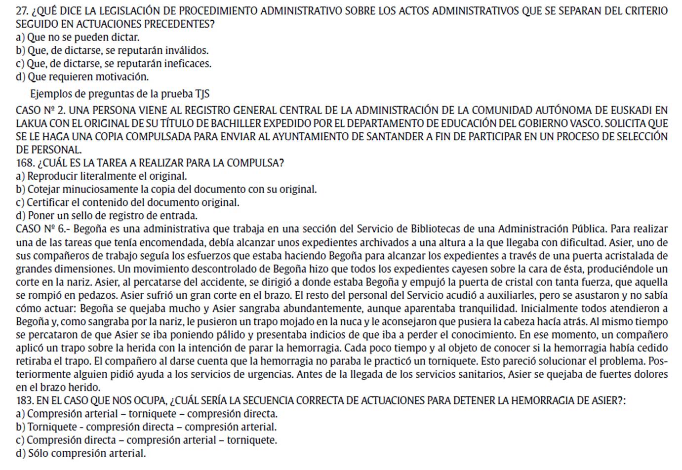 Test de juicio situacional (TJS). Se empleó un cuestionario de 47 preguntas con cuatro alternativas de respuesta (de las cuales solo una era correcta), en las que se penalizaron las respuestas erróneas del mismo modo que en la prueba de conocimientos. De las 47 preguntas, 36 hacían referencia a 8 casos prácticos y las 11 preguntas restantes contaban con enunciados que planteaban situaciones prácticas de diversa índole. La puntuación máxima alcanzable por los candidatos según las bases de la convocatoria fue de 42 puntos. Esta prueba era obligatoria y eliminatoria.