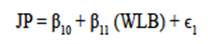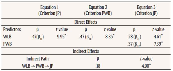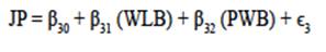 Mediation test (hypothesis 1). Based on Baron and Kenny (1986), Muller, Judd, and Yzerbyt (2005) suggested a three-step process for testing mediation effect. Each step involves a distinct regression equation. So, we performed multiple linear regression analyses to estimate the following equations (1 to 3), where, JP = Job performance, WLB = Work-life balance, and PWB = Psychological wellbeing.
