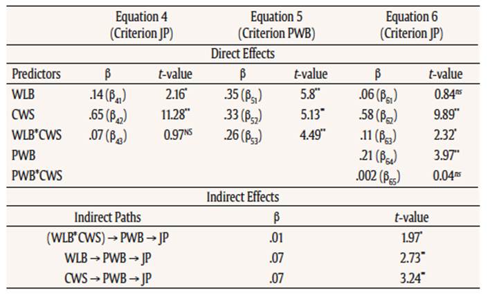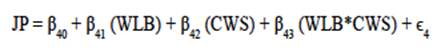 Moderated mediation test (hypothesis 2).Muller et al. (2005) suggested a three-step process for testing moderated mediation. Each step involves a distinct regression equation. So, we performed multiple linear regression analyses to estimate the following three equations (4 to 6), where, JP = Job performance, WLB = Work-life balance, PWB = Psychological wellbeing, and CWS = Satisfaction with coworkers; * shows the interaction or multiplication of two variables (i.e., interaction term for testing moderating effect).