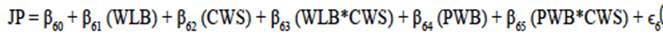 Once either or both of these conditions are satisfied, determining moderated mediation requires that the moderating effect of residual WLB on JP, i.e., β63 , be significant. Table 8 shows that our β63 is significant.
