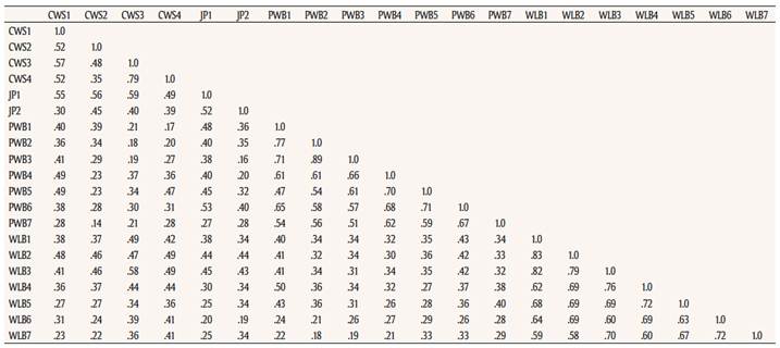Table 1 shows inter-item correlations, while Table 2 exhibits the factor loadings of individual items, Cronbach’s alpha, composite reliability (CR), and average variance extracted (AVE) for the latent variables. Values in Table 2 indicate that our data are valid and reliable at item and construct level except for the factor loading of the last item of the work-life balance construct (.39). Hair, Hult, Ringle, and Sarstedt (2016) recommend that items with loadings below .40 should not be considered for analysis. So, this item was deleted.