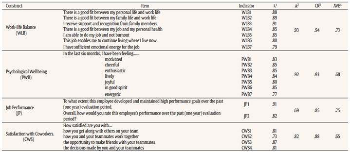 Data were collected by using established questionnaires in existing literature (see Table 2). Job performance was measured by adapting the 2-item questionnaire used by Wright, Cropanzano, and Bonnett (2007). A five-point Likert scale was used which ranged from never (1) to always (5) for the first item, and from poor (1) to excellent (5) for the second item. Psychological wellbeing was measured by adapting a 7-item questionnaire used by Hess, Kelloway, Francis, Catano, and Fleming (2005). Wu, Rusyidi, Claiborne, and McCarthy’s (2013) 8-item questionnaire was adapted to measure work-life balance. For both of these measures, a five-point Likert scale, ranging from strongly disagree (1) to strongly agree (5), was used. The measure of satisfaction with coworkers was adapted from Bishop and Scott (2000). For this instrument, a five-point Likert scale, ranging from extremely dissatisfied (1) to extremely satisfied (5), was used.