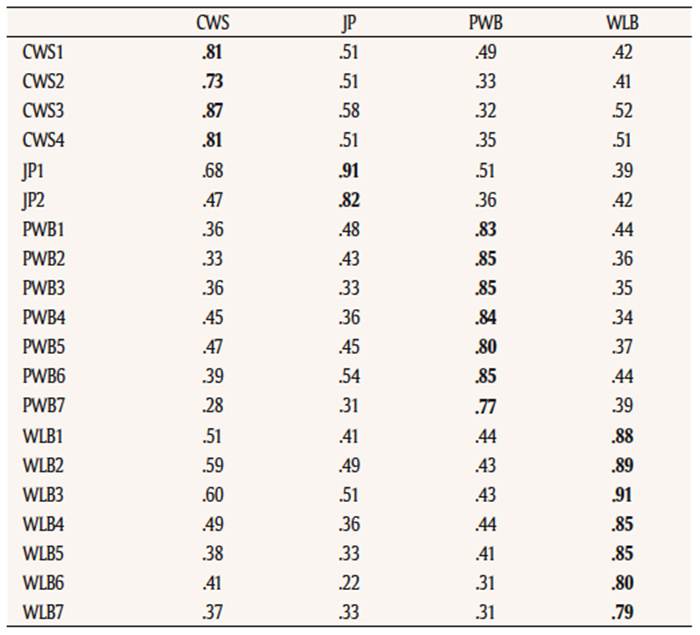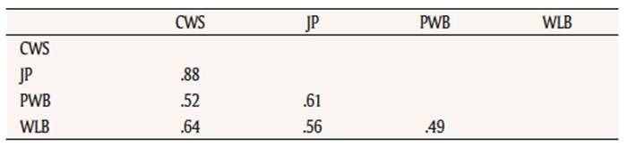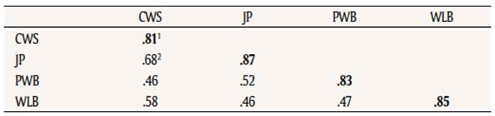 In Fornell and Larcker (1981) criterion, the square root of each construct’s average variance extracted (AVE) is compared with its bivariate correlations with all opposing constructs (Grégoire & Fisher, 2006). Discriminant validity exists if AVE square root for each construct is greater than the values of its bivariate correlations (Ringle et al., 2010). For example, Table 2 shows that the AVE value for the work-life balance (WLB) construct is .73, and its square root is .85, which has been shown in Table 4. This value is greater than WLB’s bivariate correlations with all opposing constructs and shows that discriminant validity has been established for the WLB construct.