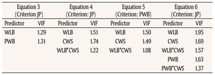 Table 7 shows the summarized results of the estimated structural model from PLS-SEM analysis. Muller et al. (2005) suggested that a variable functions as mediator when it fulfills four conditions. The first condition is that in the absence of a potential mediator the relationship between independent and dependent variable must be significant (equation 1). The second condition is that the predictor (WLB) in equation 2 must significantly impact the mediator (PWB). The third condition is that in equation 3, controlling for the effect of the predictor (WLB), the mediator (PWB) must significantly influence the outcome variable (JP). Table 7 shows that our mediation model the above three conditions. In addition, the indirect effect through the mediating variable (the entire path from WLB to JP) must be significant after including a mediator in PLS path model. The bootstrapping of indirect path in SmarPls provided results about indirect effect (Table 7), and we found it significant (β = .18, t = 4.90, p < .01). The fourth condition is that the previously significant path coefficient between the independent and dependent variables (WLB to JP) must significantly change its value (magnitude) in the presence of the mediator. Estimates of equation 3 in Table 7 indicate that, by including the mediator in the model, the value of path coefficient was reduced significantly, from .47 to .28. However, the significant relationship between WLB and JP in equation 1 (t-value = 9.95) remained significant in the presence of mediator in equation 3 (t-value: 4.61). The significance of WLB and JP relationship in both models (Equation 1 and 3), but a considerable reduction in the magnitude of path coefficient for this relationship in equation 3 suggests partial mediation (Baron & Kenny, 1986; Muller et al., 2005). In addition to this, variance accounted for (VAF) was calculated to assess the strength of mediation effect. Hair et al. (2016) suggested the calculation of VAF instead of applying a commonly used Sobel test because the distributional assumptions of Sobel test do not hold for indirect effect, and lacks statistical power. Calculating VAF is considered only if the indirect effect is significant. Table 6 shows that the indirect effect is significant in our mediation model. VAF determines the size of the indirect effect (.18) in relation to the total effect (direct effect + indirect effect, which is .28 + .18 = .46): VAF = .18/.46 = .39. VAF between .20 and .80 indicates partial mediation (Hair et al., 2016), which is the case in our model.
