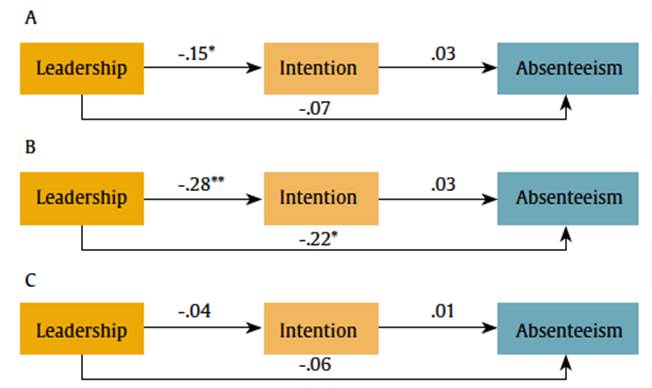 Path analyses. The evidence contradicted Hypothesis 1 (effects of people-oriented leadership on absenteeism mediated by turnover intention) derived from the spillover model of Beehr and Gupta (1978) and Hypothesis 2 (independent effects of people-oriented leadership on turnover intention and absenteeism) derived from the March and Simon’s (1958) model: only direct leadership-intention relationships were observed (see Figure 1A). In contrast, positive results were obtained regarding Hypothesis 3: whereas people-oriented leadership determined both turnover intention and absenteeism among low-employability workers (Figure 1B), it did not among highly employable workers (Figure 1C).