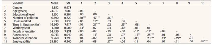 Only 255 cases had scores on all the study variables. The internal-consistency reliabilities of people-oriented leadership, employability, and turnover intention were, respectively, α = .95, α = .88, and α = .78. Non-responders to the Competing Values Framework Managerial Behavior Instrument presented greater absenteeism (Mean = .0494) than responders (Mean = .0427), a significant difference (t = -2.118, p = .035). Similarly, non-responders to the employability and turnover questionnaires presented greater absenteeism (Mean = .052) than responders (Mean = .038), a significant difference (t = -2.515, p = .013).