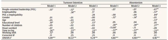 Multiple regression. These analyses were conducted to cross-check the leadership x employability interaction. It can be seen in Table 2 that the results upheld Hypothesis 2 regarding turnover intention and Hypothesis 3 regarding absenteeism. Whereas people-oriented leadership was associated with reduced turnover intention across the board and neither people-oriented leadership nor employability affected absenteeism under regression models 1 and 2, their interaction did under model 3. It can also be noted in Table 2 that turnover intention was codetermined by educational level and time in the organization and absenteeism by age (with negative sign), number of children, and time in Org (with negative sign).