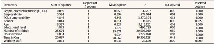 Table 1 shows the means, standard deviations, and correlations between the study variables. People-oriented leadership correlated negatively with turnover intention, whereas education positively influenced employability. It can be seen that absenteeism negatively correlates with age, number of hours worked, and time in Org, whereas turnover intention increases with education, time in Org, and in the abnormal (afternoon and night) shifts. The positive relationship between employability and turnover intention is consistent with the literature (e.g., Van der Heide & Van der Heyden, 2006); on the other hand, the 0 correlation between the withdrawal behaviors is consistent with March and Simon’s (1958) model.