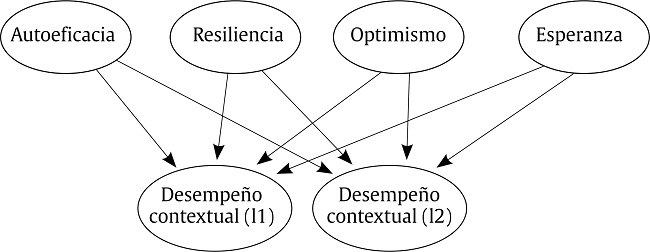 En relación con lo anterior, el modelo propuesto estará definido por la relación entre el capital psicológico (variable latente) y sus indicadores, en este caso, resiliencia, autoeficacia, optimismo y esperanza. El modelo estructural estaría compuesto por las relaciones causales entre el capital psicológico y el desempeño contextual autoevaluado por los trabajadores a través de observación y anclaje conductual, respectivamente.
