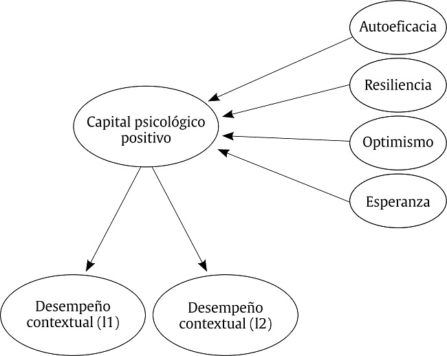 En la Figura 2 se plantea la relación de los 4 componentes, autoeficacia, resiliencia, optimismo y esperanza, con la variable latente capital psicológico y la relación de ésta con el desempeño contextual. Este modelo se plantea para evaluar las H1 y H2.