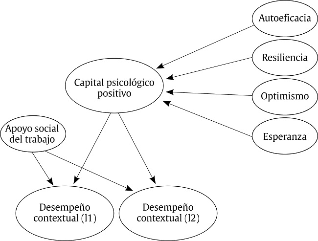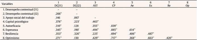 No significant relationship was found between work social support and contextual performance I1 and I2. In spite of the above, a significant relationship between work social support and psychological capital is evidenced in the results.