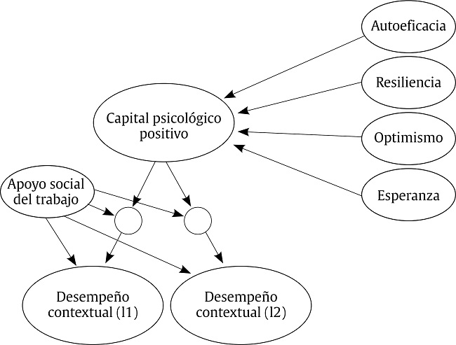 Con base en lo anteriormente expuesto es que en este estudio se propone un modelo teórico que integra la relación entre las características autoeficacia, resiliencia, optimismo y esperanza con la variable latente capital psicológico y a su vez la relación de esta variable latente con el desempeño contextual autoevaluado a través de la observación del comportamiento y de calificación referida a conductas (incidentes críticos). Se plantea además la relación del apoyo social del trabajo con el desempeño contextual y se establece una relación de moderación del apoyo social en la relación del capital psicológico y el desempeño. Este modelo permite plantear la cuarta hipótesis de investigación: