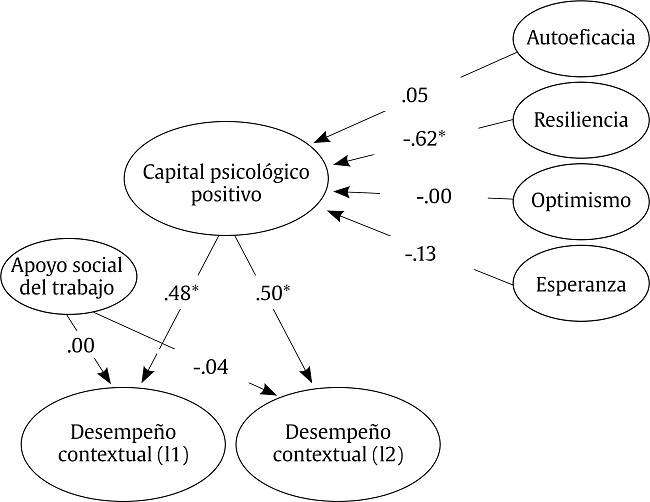 The analysis of results of the proposed MIMIC model confirms theoretically that the psychological capital would have as indicators the factors that are part of it, self-efficacy, optimism, hope, and resilience, the latter being the most important for the relationship of these factors with the proposed construct or latent variable. Also the contextual performance measured with both instruments as a consequence is established within this model. In summary, the theoretical model explains what is proposed, this being the basis for a later analysis carried out to determine the role of social support within the model.