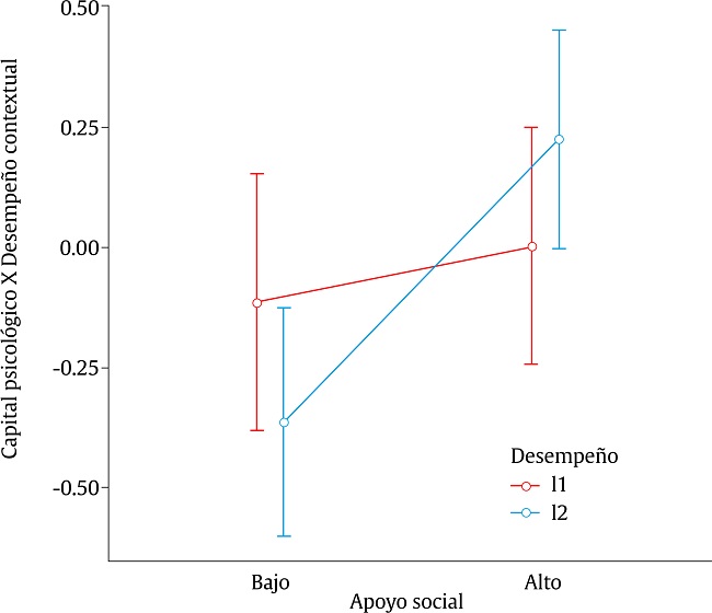 H4. El apoyo social de diseño del trabajo se comportará como una variable moderadora en la relación de las variables capital psicológico y el desempeño contextual. La combinación entre altos niveles de capital psicológico y alta percepción de apoyo social se asociarán a un mayor nivel de desempeño contextual en comparación con un alto nivel de capital psicológico y baja percepción de apoyo social.