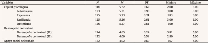 Se observan dentro de los resultados descriptivos de la muestra (Tabla 2) que la media de las puntuaciones del capital psicológico y sus componentes es similar, además, existe una leve diferencia entre las medias obtenidas en el desempeño contextual I1 (comportamientos observados), siendo esta mayor que la media de I2 (anclas conductuales).