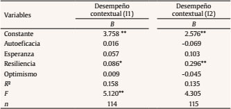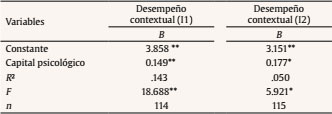 En relación con las dos primeras hipótesis de esta investigación, con el fin de conocer la dirección de las relaciones antes descritas, y con ello determinar la predicción de variables, es que se utilizó un análisis de regresión lineal, definiendo como variables dependientes el desempeño contextual (I1 e I2) y las variables predictoras del modelo que son definidas por capital psicológico, autoeficacia, esperanza, resiliencia y optimismo. Como se puede observar en la Tabla 4 y en la Tabla 5, existe evidencia significativa para afirmar que la variable capital psicológico (B = 0.149, p < .001) y la variable resiliencia (B = 0.086, p < .005) sí influyen en el desempeño contextual I1, así como también influyen las mismas variables en el desempeño contextual I2 con los valores (B = 0.177, p < .005) y (B = 0.296, p < .001) respectivamente. Por otra parte, para las variables autoeficacia, esperanza y optimismo no existe evidencia significativa, es decir, no influyen en el desempeño contextual (I1 y I2).