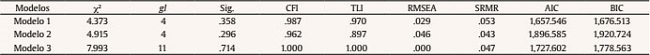 Es importante destacar que los valores de los indicadores de ajuste para los modelos propuestos son aceptables. Los valores de RMSEA bajo .03 indican excelente bondad de ajuste a los datos, bajo .05 muy bueno y bajo .08 bueno (Williams, Ford y Nguyen, 2004). Los valores de SRMR inferiores a .08 indican un buen ajuste a los datos, mientras que los valores inferiores o iguales a .09 son aceptables siempre y cuando RMSEA o CFI corroboren la bondad de ajuste del modelo (Hu y Bentler, 1999). Finalmente, valores de CFI iguales a .95 indican que un modelo muestra un buen ajuste a los datos (Hair, Black, Babin y Anderson, 2010; Hu y Bentler, 1999), aunque algunos autores sostienen que los valores de .90 o incluso .80 son aceptables (Hair et al., 2010). En cuanto a TLI, valores más cercanos a 1 muestran el mejor ajuste, mientras que los indicadores BIC y AIC, que sirven para comparar modelos, tienden a penalizar la complejidad, por lo que cuanto mayor sea su valor, menor será la bondad de ajuste de un modelo (Arbuckle, 2013).