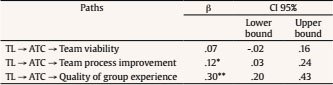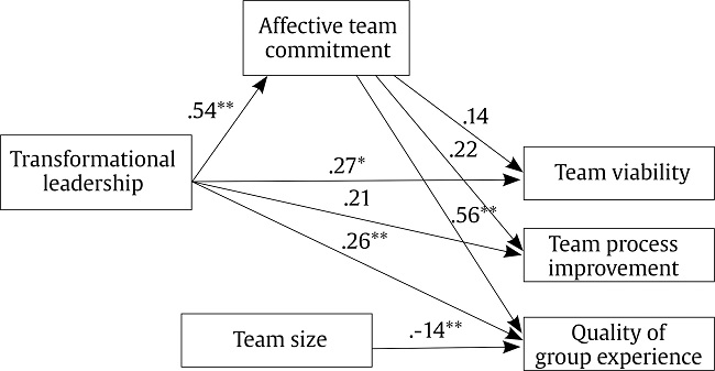 The main objective in this research was to study the effect of the affective dimension of commitment on overall team effectiveness, when shaped by the transformational leadership style of the team direct supervisor. According to our findings, it seems that transformational leadership has both a direct effect and also an indirect effect, through affective team commitment, on quality of group experience. Thus, affective team commitment positively and partially mediates the relationship between transformational leadership and quality of group experience. This means that the experience of positive social climate within the team is improved when team members are emotionally committed to the team and such commitment is generated by the transformational style of their leaders. This result corroborates the idea that affective aspects such as quality of group experience are strongly affected by affective/motivational team processes and states as it is the case of affective team commitment (Kozlowski, Grand, Baard, & Pearce, 2015). This effect is especially relevant when the latter is shaped by transformational leadership.