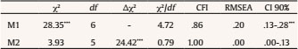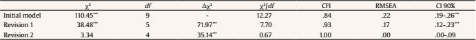 Then the model obtained through the EFA was tested using CFA. Following the recommendations of Byrne (2010), we checked the chisquare test, the CFI (comparative fit index), and the RMSEA (root mean square error of approximation) and its confidence interval (see Table 1). The results of the CFA indicated a poor goodness of fit, showing an inadequate adjustment between data and the hypothesized model, χ2(9) = 110.45, p <.001, CFI = .84, RMSEA = .22, intervals of confidence 90% between .19 and .26, statistically significant (Table 1). After adjustments were made considering both the statistical (namely the modification indices provided by AMOS) and the theoretical basis (removing item 3 for overlapping content and correlating errors of item 1 and item 4), a significant improvement in fit indices was obtained, χ2(4) = 3.34, p = .501, Δχ2(1) = 35.14, p < .001, CFI = 1.00, RMSEA = .00; intervals of confidence 90% between .00 and .09, statistically significant, which showed a good fit between the variance-covariance matrix and the tested model. Cronbach’s alpha was .83.