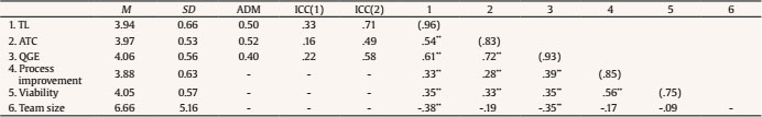 Table 2 reports means, standard deviations, ADM, ICCs, correlations, and reliability coefficients of the variables considered in this study. Team size was included as control variable and only quality of group experience was significantly related to team size. Table 2 shows that correlations between all variables considered are positive and significant, which is in line with what was expected in the hypotheses.