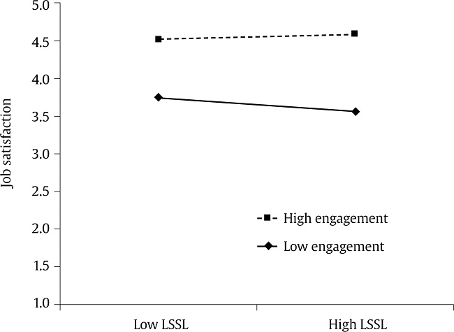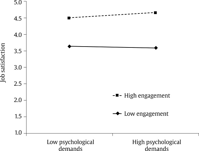To evaluate whether the significant interaction provided support to H2, we plotted the slopes at one standard deviation below and above the mean (Cohen et al., 2003; Frazier et al., 2004; see Figure 1). To further test the interaction, we followed the procedure used by Kacmar et al. (2009) and conducted simple slope tests by using the software designed by Preacher et al. (2006). Our results show that the slope for the high engagement line is significant, t(169) = 2.07, p < .05, unlike the slope for the low engagement line, t(169) = -0.62, p = .53. This suggests that an increase in psychological demands seems to have a positive effect on job satisfaction when individuals are highly engaged, thus partially supporting H2.