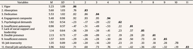 The six psychosocial factors showed low to moderate correlations among each other (ranging from .12 to .73). Only insufficient autonomy, lack of social support and leadership, insufficient esteem, and job insecurity displayed negative and statistically significant correlations with job satisfaction, suggesting that stronger perceptions of exposure to these four psychosocial risks are associated with lower levels of job satisfaction. In terms of the core traits of work engagement, as expected, measures of vigor, absorption, and dedication displayed high and positive non-zero correlations with one another (r above .76, p < .01). Moreover, work engagement was found to be positively related to overall job satisfaction (r = .76, p < .01), suggesting that more engaged employees are likely to feel more satisfied with their jobs.