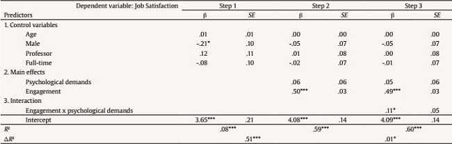 High job demands. As shown in the top portion of Table 2, none of the control variables were significant predictors of job satisfaction. Moreover, the three psychosocial risk factors representing job demands failed to significantly explain job satisfaction, therefore not supporting H1. Work engagement, on the other hand, was found to be a significant predictor in the three cases (β =.49, p < .01). H2 proposed that the negative relationship between perceived exposure to psychosocial risks and job satisfaction was higher for those individuals who reported lower levels of work engagement. As shown in the bottom portion of Table 2, we found that work engagement indeed moderated the psychological demands-job satisfaction relationship (β = .11, p < .05). No moderating effects, however, were found for the double presence-job satisfaction and job insecurity-job satisfaction links (Tables 3 and 4).