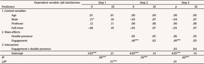 • Double presence (α in this study = .61), which refers to the degree to which an employee feels that they need to face both work and home-related demands simultaneously (4 items, including “There are times when I feel I have to be at work and at home at the same time”).