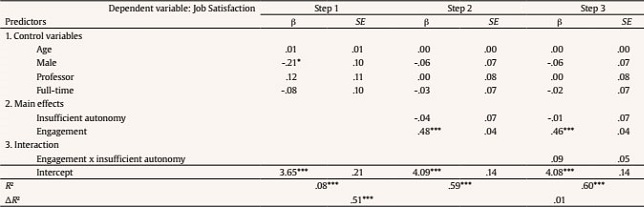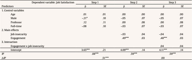 The purpose of this study was to examine the moderating role of work engagement in the relationship between perceived exposure to psychosocial risks and job satisfaction in a sample of Argentinian scholars. To this end, we considered six psychosocial risk factors as highly relevant for explaining employees’ job satisfaction (namely, psychological demands, insufficient autonomy, lack of social support and leadership, double presence, insufficient esteem, and job insecurity) and stated that the impact of these psychosocial risk factors at work on job satisfaction would be moderated by work engagement. Regarding their main effects on job satisfaction, hierarchical regression analyses revealed that none of the psychosocial risk factors showed incremental explanatory power over job satisfaction once work engagement was considered. Work engagement, on the other hand, was found to be a strong and significant predictor of scholars’ job satisfaction, which is consistent with what has been previously reported in the literature (e.g., Alarcon & Lyons, 2011; Kašpárková et al., 2018; Mudrak et al., 2017; Rich et al., 2010; Saks, 2006).