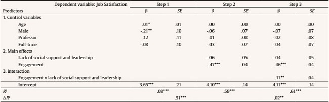 In spite of the fact that the moderating role of work engagement in stressor-strain relationships has certainly been understudied in the field of organizational psychology (Britt & Bliese, 2003), this modest body of literature has much to offer to the investigation of scholars’ job satisfaction as a response to psychosocial risk factors. To provide an example, in a study conducted by Leiter & Harvie (1998) with a sample of 3,312 employees from a large healthcare institution, the authors found that work engagement indeed moderated the relationship between supportive supervision, confidence in management, effective communication, work meaningfulness, and acceptance of change. In a more recent study, Britt & Bliese (2003) analyzed whether engagement moderated the stressor-strain relationship in a sample of U.S. soldiers. In their research, Britt & Bliese (2003) found evidence of the buffering role of engagement against stress. Specifically, they reported that when stressor levels were high, soldiers who were engaged with their job reported less elevation in reports of psychological distress than soldiers who were less engaged with their job. Similar results are later reported by Britt et al. (2005) in their longitudinal study conducted on a sample of 177 U.S. soldiers, revealing that highly engaged soldiers were less likely to experience negative health consequences under high levels of training and work hours in comparison to less engaged soldiers.