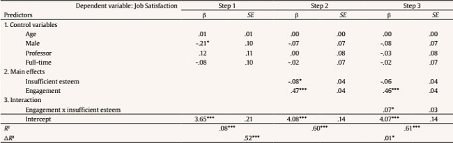 Low job resources. We obtained similar results for the three remaining psychosocial risk factors that represent low job resources. As it can be seen in the middle portion of Tables 5, 6, and 7, our results indicate none of these psychosocial risk factors significantly explained job satisfaction, whereas work engagement was found to be a significant predictor in the three cases. As shown in the bottom portion of Tables 5, 6, and 7, only the interaction terms between lack of social support and leadership and work engagement and between insufficient esteem and work engagement were statistically significant.