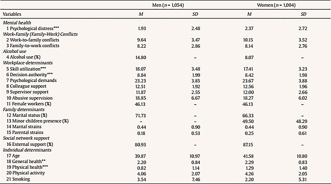 Family determinants. Guided by the multilevel determinants of mental health model (Marchand, Demers, & Durand, 2005a; Marchand et al., 2014), non-work determinants will also be examined in this study to take into account both micro and macro analysis of individuals’ lives (Turner, 2005). Marital status was coded 1 for people who were married or cohabiting, and 0 for others. Parental status was coded 1 for having one or more minor children, and 0 for no minor children. Marital strains were assessed by four “true or false” questions regarding stress in the marital relationship (α = .70 for both men and women), such as “Your partner doesn’t understand you” (Wheaton, 1994). Parental strains contain three “true or false” items also from Wheaton, such as “Child’s behaviour is a source of serious concern to you” (α = .61 for men and α = .59 for women).