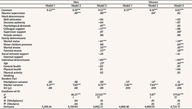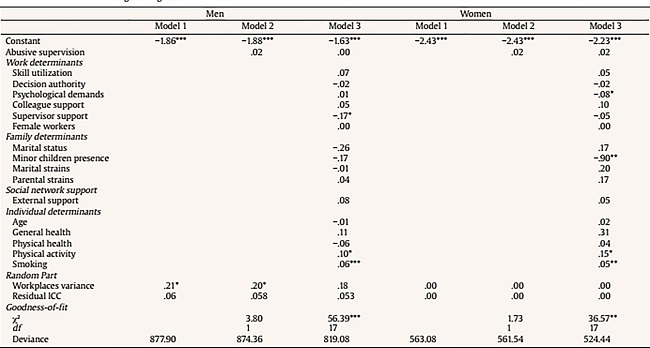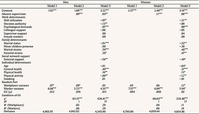 Finally, Model 3 (see Table 3) showed that abusive supervision was positively related to psychological distress after controlling for work, family, social network, and individual determinants. Furthermore, there were some gender differences among work determinants. Skill utilization and psychological demands were associated with psychological distress for both men and women, but decision authority was a significant predictor for men only. This third model accounted for about 29% of variations between workplaces and 29% between workers for men, and 11% of variations between workplaces and 18% between workers for women. Likelihood-ratio tests indicated that Model 3 had a significant better fit than Model 2 and Model 1 for both men and women across all the outcome variables (ps < .01).