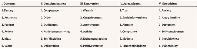 Personality theory is about the systematic study of the similarities and differences in personality between people, in which personality means how the individual acts (1) in his social environment, (2) with other people, and (3) in different situations (Ekkel & Ranty, 2006). Personality itself is conceptualised as a stable system of tendencies to act, think, and feel in a certain way (Digman, 1990; Guilford, 1959). Today, the most popular model of personality used for investigating employee personality is the five factor model, or FFM (Costa & McCrae, 1985). This model suggests that personality, viewed from a trait approach, consists of five major clusters of personality characteristics: openness, conscientiousness, extraversion, agreeableness, and neuroticism, also known as the OCEAN-model (Digman, 1996). Each of the five factors of the FFM contains six subscales, known as personality facets (Costa & McCrae, 1991). These 30 facets, as presented in Table 1, jointly give a detailed view on the composition of the five main factors. When the 30 facets are factor-analysed, the five factors emerge, each defined by high loadings from six facets of the same scale (Costa & McCrae, 1991). The FFM underlies different personality tests, like the NEO-PI-R (Costa & McCrae, 1985), the NEO-FFI (Costa & McCrae, 1991), and the FFPI (Hendriks, Hofstee, & De Raad, 1999). In investigating the intrapersonal fit between personality facets and work values, the present study uses these 30 personality facets behind the five clusters of the FFM in order to further elucidate which personality traits and work values relate the strongest (Parks, 2007; Parks-Leduc et al., 2015). With this, the study follows Ones & Viswesvaran (1996) in their view on the bandwidth-fidelity dilemma in personality measurement for personnel selection purposes.