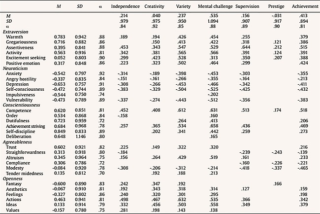 Table 2 reports the descriptive statistics of means, standard deviations, Cronbach’s alpha, and inter-correlations for the intrinsic work values and the personality facets behind the five factors. The facets behind extraversion related positively to six of the seven intrinsic work values. Five of the six facets behind neuroticism related negatively to six of the seven intrinsic work values. The facets behind conscientiousness related positively to mental challenge as the intrinsic value. Its facet achievement striving showed a positive relation to six of the seven intrinsic work values. The facets behind agreeableness showed a somewhat contradictory picture. The altruism facet related positively to six of the seven intrinsic values, whereas the modesty facet related negatively to all of the intrinsic values. The majority of the facets behind the openness factor related positively to five of the seven intrinsic work values.