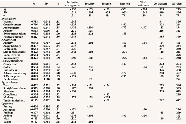 Table 3 reports the descriptive statistics of means, standard deviations, Cronbach’s alpha, and inter-correlations for the extrinsic work values and the personality facets behind the five factors of the NPT. The facets behind extraversion showed a somewhat contradictory picture. All its facets related negatively to the aesthetics/management extrinsic work value, whereas the majority of its facets related positively to co-workers and altruism. Five of the six facets of neuroticism related positively to aesthetics/management and negatively to co-workers and altruism. The facets behind conscientiousness related positively to co-workers and altruism, whereas three of its facets related negatively to aesthetics/management and lifestyle. Most of the facets behind agreeableness related positively to co-workers and altruism, while the same facets related negatively to income. The facets behind openness related negatively to aesthetics/management, whereas the majority of its facets related positively to altruism.