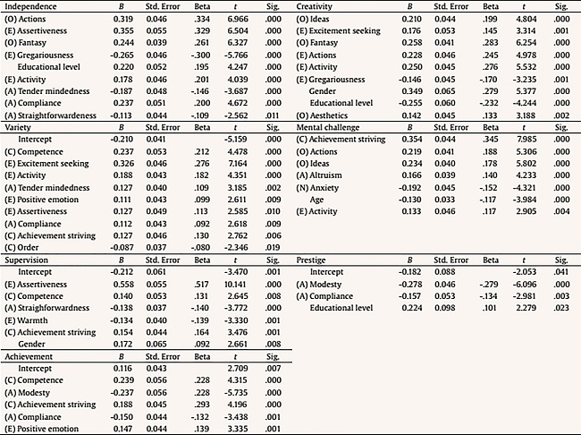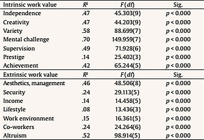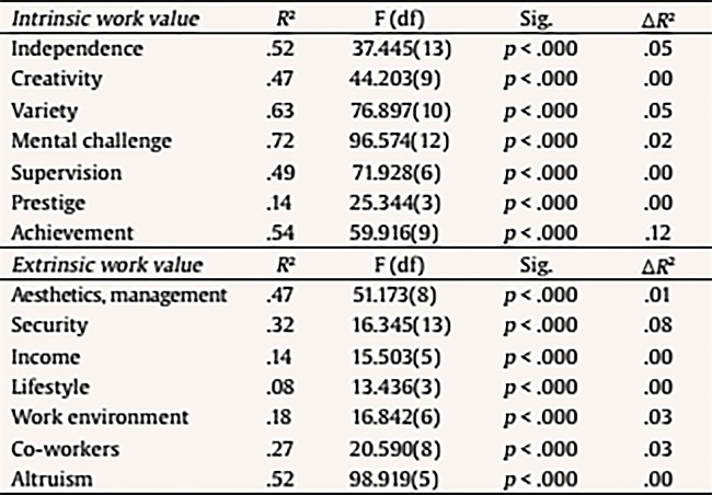 Table 4 gives the results of the model summary of the stepwise multiple linear regression analyses, predicting both the seven dependent intrinsic work values and the seven dependent extrinsic work values with the independent personality facets and the gender, educational level, and age background variables. The personality facets and the gender, educational level, and age background variables explained 14% to 70% with an average of 47% of the variance in intrinsic work values and 8% to 52% with an average of 28% of the variance in extrinsic work values.