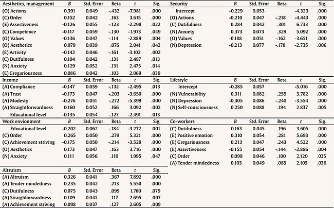 Table 6 gives the results of the stepwise multiple linear regression analyses, predicting the seven dependent extrinsic work values with the independent personality facets and the gender, educational level, and age background variables. The variance in the extrinsic aesthetics/management work value was mainly explained by the facets of the conscientiousness, extraversion, and openness factors. The variance in security was mainly explained by the facets of neuroticism and openness. The variance in income and altruism both were mainly explained by the facets of the agreeableness factor. The variance in lifestyle was described by the facets of neuroticism. The variance in work environment was primarily explicated by the facets of conscientiousness. And co-workers was mainly explained by the facets of conscientiousness and extraversion.