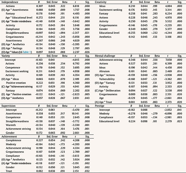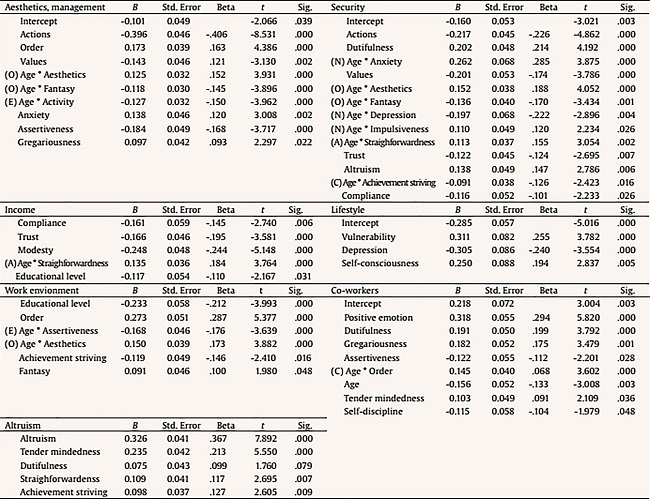 Table 9 gives the results of the stepwise moderation analyses with multiple regression analyses, predicting the influence of age in the association between the seven dependent extrinsic work values, the independent personality facets and two background variables, gender and educational level. For the aesthetics/management extrinsic work value this study found a positive interaction between age and aesthetics (openness) and negative interactions between age and fantasy (openness) and between age and activity (extraversion). For the security extrinsic value, this study found positive interactions between age and anxiety (neuroticism) and between age and aesthetics (openness). Negative interactions were found between age and fantasy (openness) and between age and depression (neuroticism). Positive interactions were found between age and impulsiveness (neuroticism) and between age and straightforwardness (agreeableness). A negative interaction was found between age and achievement striving (conscientiousness). For the income intrinsic value a positive interaction between age and straightforwardness (agreeableness) was found. For the work environment extrinsic value, a negative interaction between age and assertiveness (extraversion), and a positive interaction between age and aesthetics (openness) was found. For the co-workers extrinsic work value a positive interaction was found between age and order (conscientiousness). The study demonstrated a significant moderating influence of age in the association between personality facets and nine of the 14 work values.