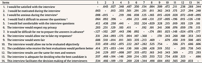 Table 1 shows the correlation coefficients between the fourteen items that composed the first version of the scale. Correlations for the experimental sample are presented below the diagonal, and correlations for the interviewees are presented above the diagonal. Correlations between most of the items are very similar in the two samples.