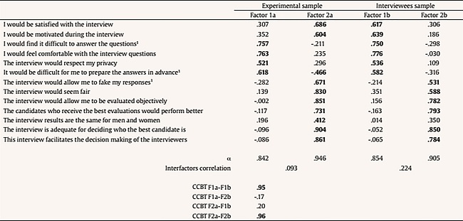 Additionally, regarding the factorial loadings that Table 2 reported for the items “I would be satisfied with the interview” and “I would be motivated during the interview”, we believe that these items were interpreted in a different way depending on the situation. In fact, only in the real evaluation situation do the items load higher in this factor than in the other. However, in the experimental sample, when the participants had been raters before, they interpreted these items according to the suitability of the interview. This is totally understandable, since the situation in which they made their evaluations determined that their perceptions of their satisfaction with the interview and their motivation during the interview were conditioned by how they perceived its suitability. Given this result, we consider it appropriate to modify the wording of these two items in the following way: “I would be satisfied with my results in the interview” and “I would be motivated during the interview to get the best possible results”.