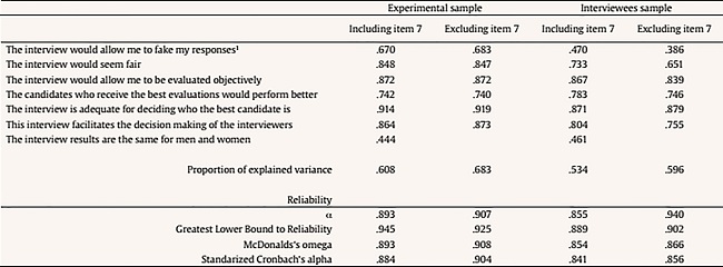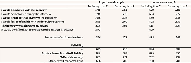 Concerning the factor of perception of the suitability of the interview for candidate evaluation, this was initially composed of 7 items: (1) “The interview would allow me to fake my responses”, (2) “The interview would seem fair”, (3) “The interview would allow me to be evaluated objectively”, (4) “The candidates who receive the best evaluations would perform better”, (5) “The interview is adequate for deciding who the best candidate is”, (6) “The interview facilitates the decision making of the interviewers”, and (7) “The interview results are the same for men and women”. However, Table 2 results suggested that this last item could be deleted from the scale. The results of the confirmatory factorial analyses carried out only with the items that composed this factor, including and excluding item 7, are reported in Table 4. Data recommended the use of the scale excluding this item, since the proportion of the explained variance and the different reliability coefficients reported were higher.