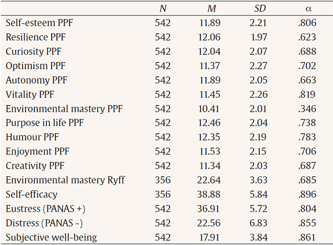 In Table 1, the mean, standard deviation, and reliability of each of the measures considered in this study are displayed. All the measures present reliability values around .70 – acceptable values in research (Abad, Olea, Ponsoda, & García, 2011) – except for environmental mastery in the PPF scale. Thus, this scale was removed from the rest of the analysis. In any case, as explained in the Measures section, this variable is measured through the environmental mastery subscale included in the Psychological Well-Being Scale (Ryff, 1989) adapted to the Spanish population by Díaz et al. (2006). This subscale is more adequate for young population.
